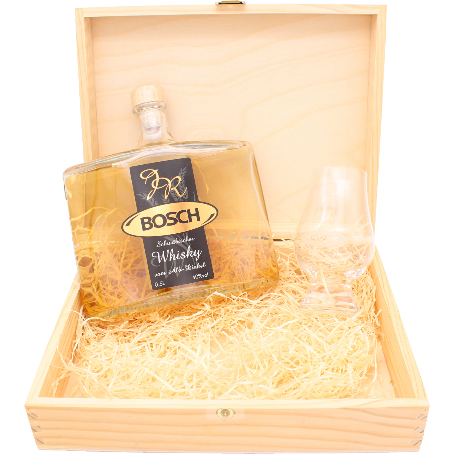 Der JR kommt zusammen mit unserem Original Bosch Whisky Glas in einer attraktiven Holzbox.
